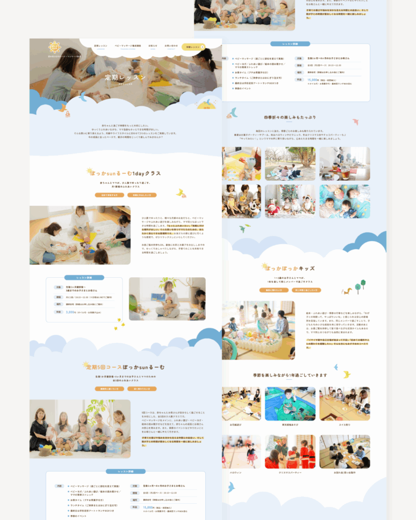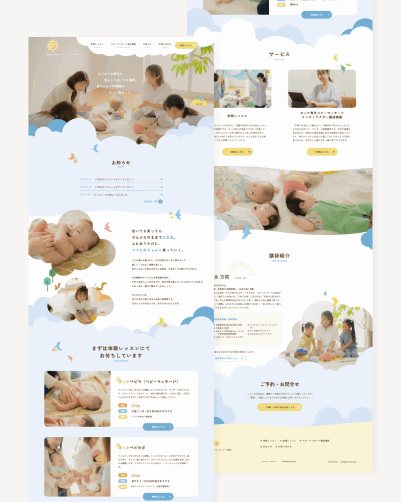 愛知県刈谷市のベビーマッサージ教室 ぽっかsun様 2026 1/20 website-works ホームページ制作 2026年1月20日 URLhttps://pocca3.com/お客様愛知県刈谷市のベビーマッサージ教室ぽっかsun様カテゴリコーポレートサイトリニューアル制作制作年2025年 website-works ホームページ制作 西八王子のフレンチビストロ BISTRO FERME様 関連記事 西八王子のフレンチビストロ BISTRO FERME様 2025年9月15日 一般社団法人 日本タッチ育児協会様様 オンライン教材-会員サイト制作 2025年5月29日 (株)BASIQUE 美甘敦子様 オンライン教材-会員サイト制作 2025年4月12日 一般社団法人 日本タッチ育児協会様 2024年12月25日 ベビーマッサージ教室FURERUtete様 2024年12月25日 インテリアコーディネート事務所 COLORDINATE様 2024年12月25日 いろはホームケアクリニック様 2024年9月30日 自宅起業サポート 藤原佳織様 新規LP制作 2024年7月25日